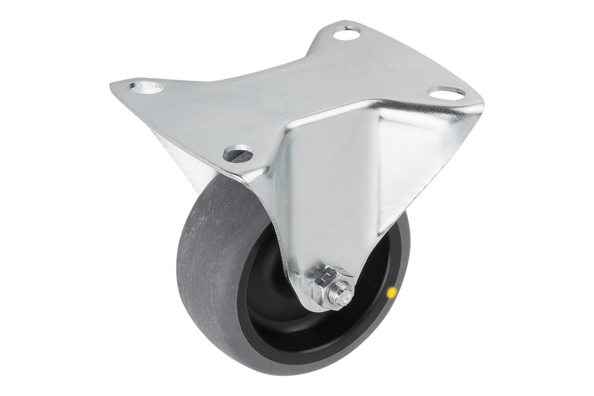 Wheel axle threaded. Swivel and fixed castors with mounting plate. Electrically conductive wheels, non-marking grey. The ohmic resistance of the wheel is less than 10⁴Ω.