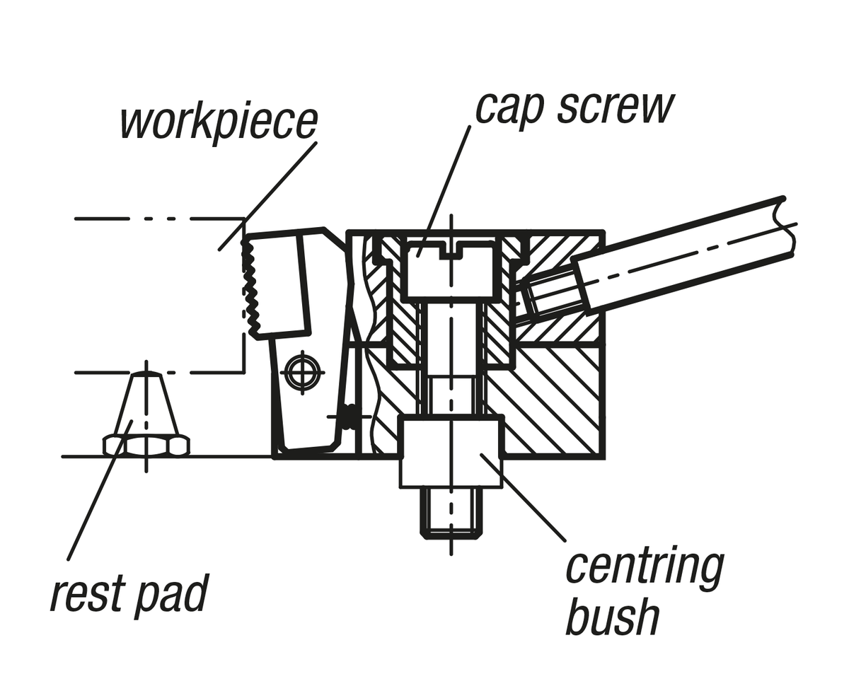 This is a quick-action side clamp where workpieces are clamped by rotating a cam wheel which exerts pressure on the swivel jaw, simultaneously producing a positive down force.