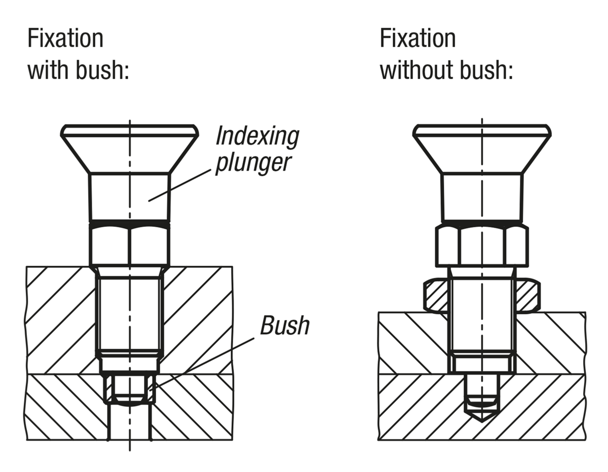 Indexing plungers are used where any change in locking position due to lateral forces should be prevented. A new indexed position can be only be moved to after the pin has been manually retracted. Form C and D are recommended for applications where the indexing pin should remain disengaged for an extended period and be prevented from springing back.