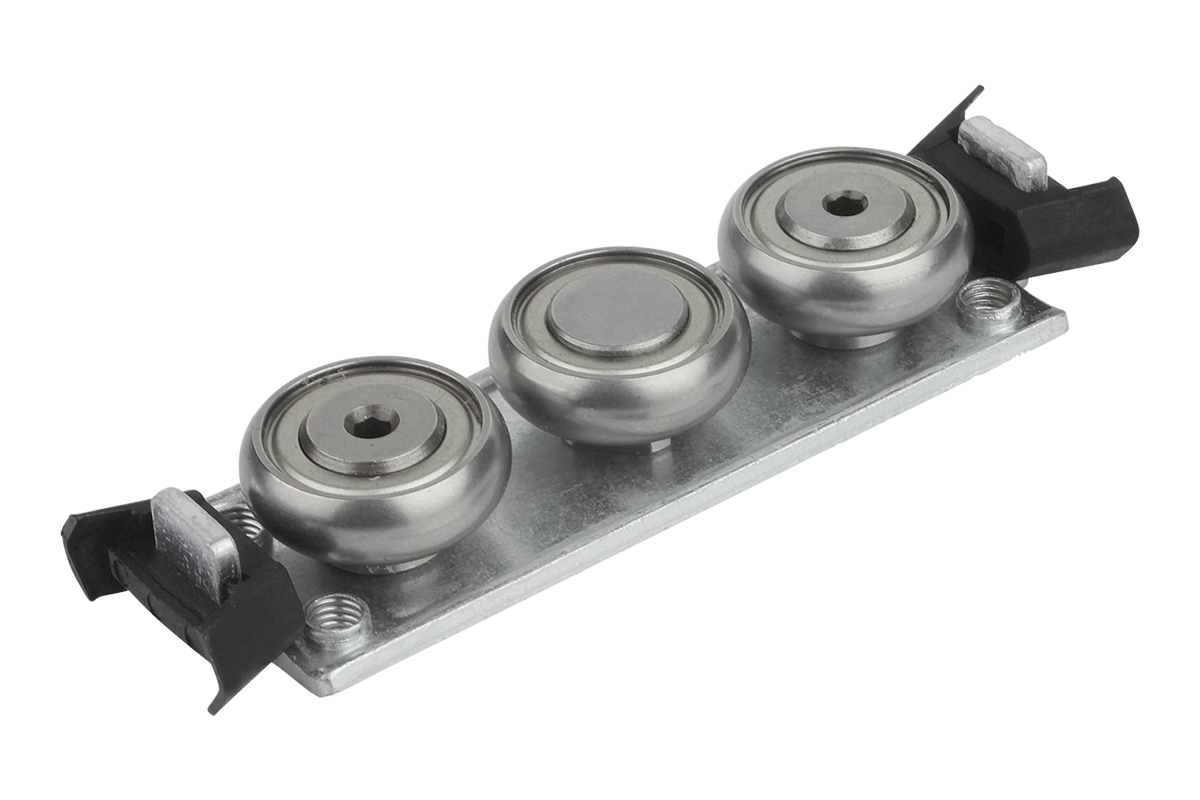 Carro guía sobre rodillos con bajo coeficiente de fricción y, por tanto, funcionamiento suave. Los pivotes de los rodillos están engrasados de forma permanente y disponen de una junta 2Z (cubierta protectora contra el polvo). Regulando fácilmente el rodillo excéntrico central, el carro guía sobre rodillos se puede ajustar en el carril sin juego o con la tensión previa deseada. La versión compacta dispone de rascadores de plástico para limpiar las vías.