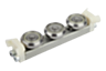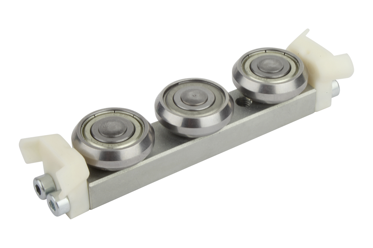Carro guía sobre rodillos con rodamiento de rodillos engrasados de forma permanente y rascadores de poliamida que protegen las vías contra la suciedad.