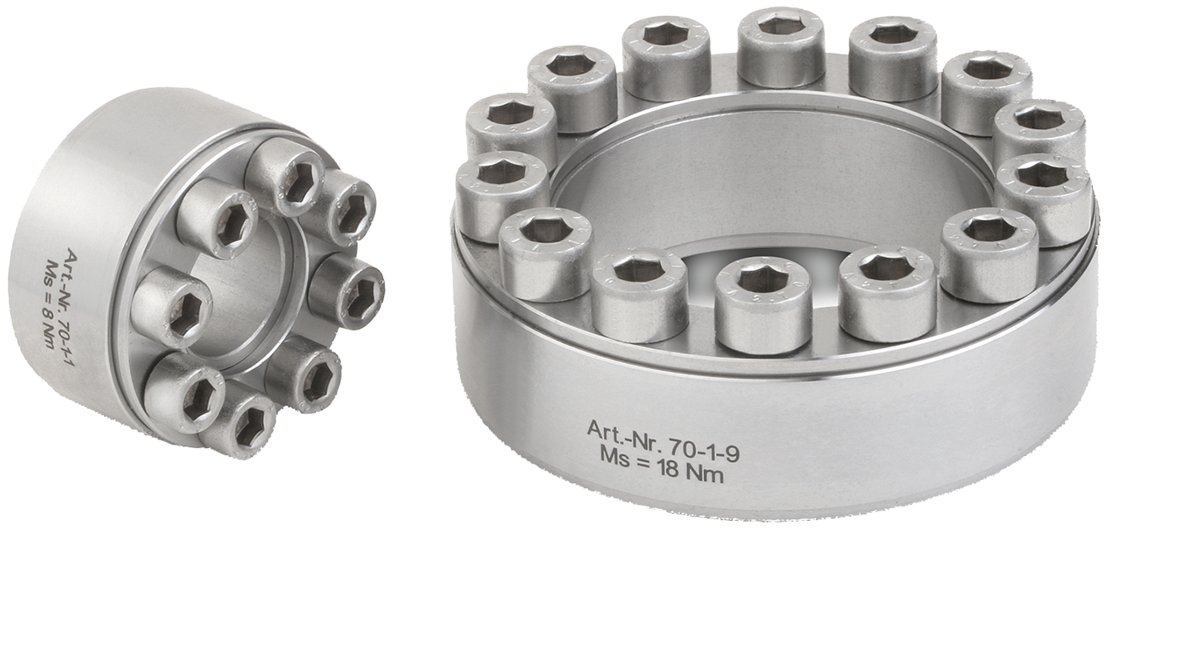 Juego de dispositivo de sujeción para árbol y cubo. Forma constructiva muy reducida ideal para el uso en condiciones de espacio reducidas. Se suelta por sí mismo durante el desmontaje.