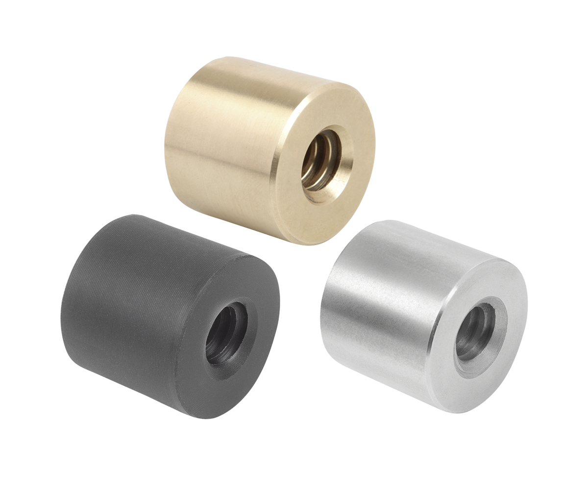 Tuercas de latón rojo: para movimientos de velocidad media-baja. Si falta lubricante, las tuercas roscadas trapezoidales de latón rojo sobre husillos de acero presentan buenas propiedades en caso de funcionamiento de emergencia.