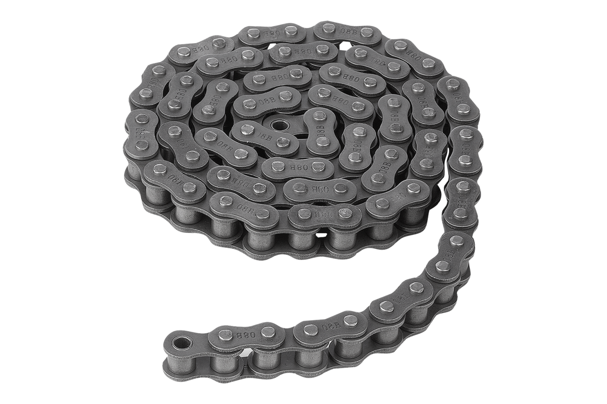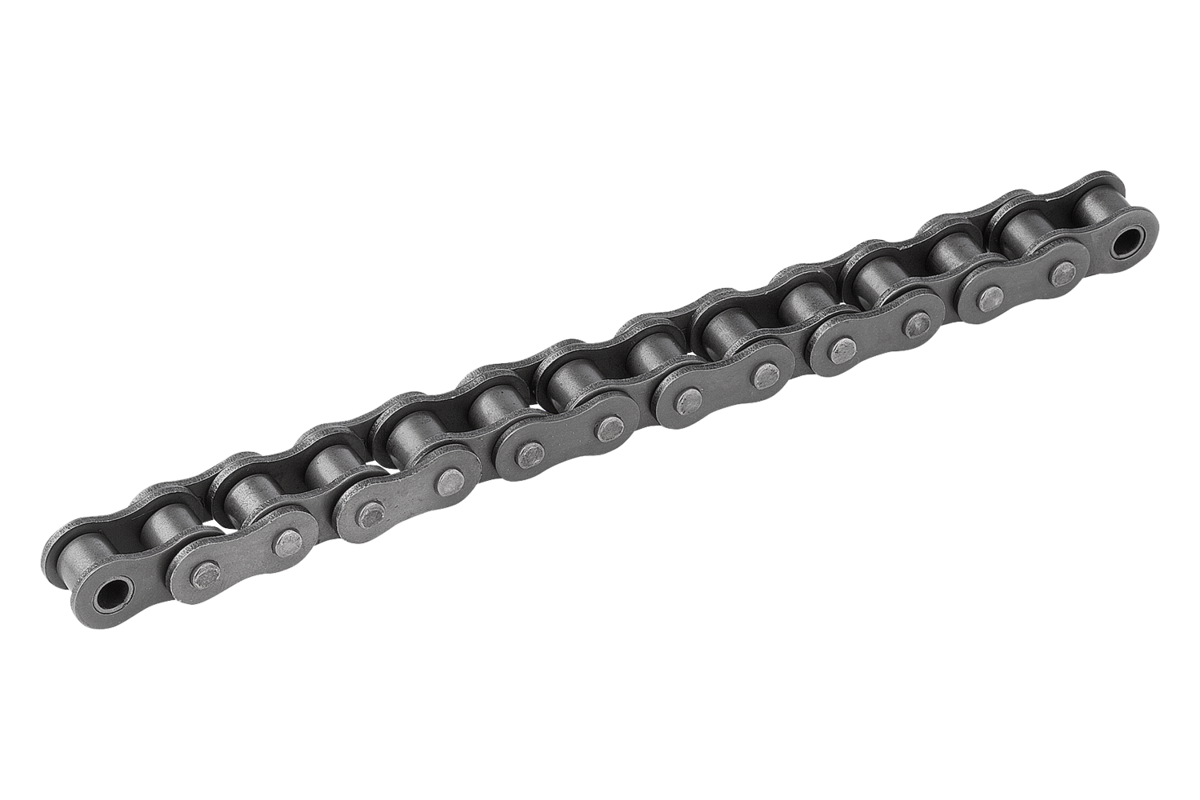 Cadenas de rodillos de diseño europeo según DIN 606 con cubrejuntas curvadas (número ISO 06 con bridas rectas). Todas las cadenas están pretensadas.