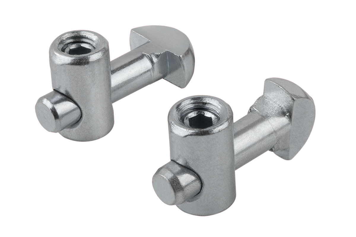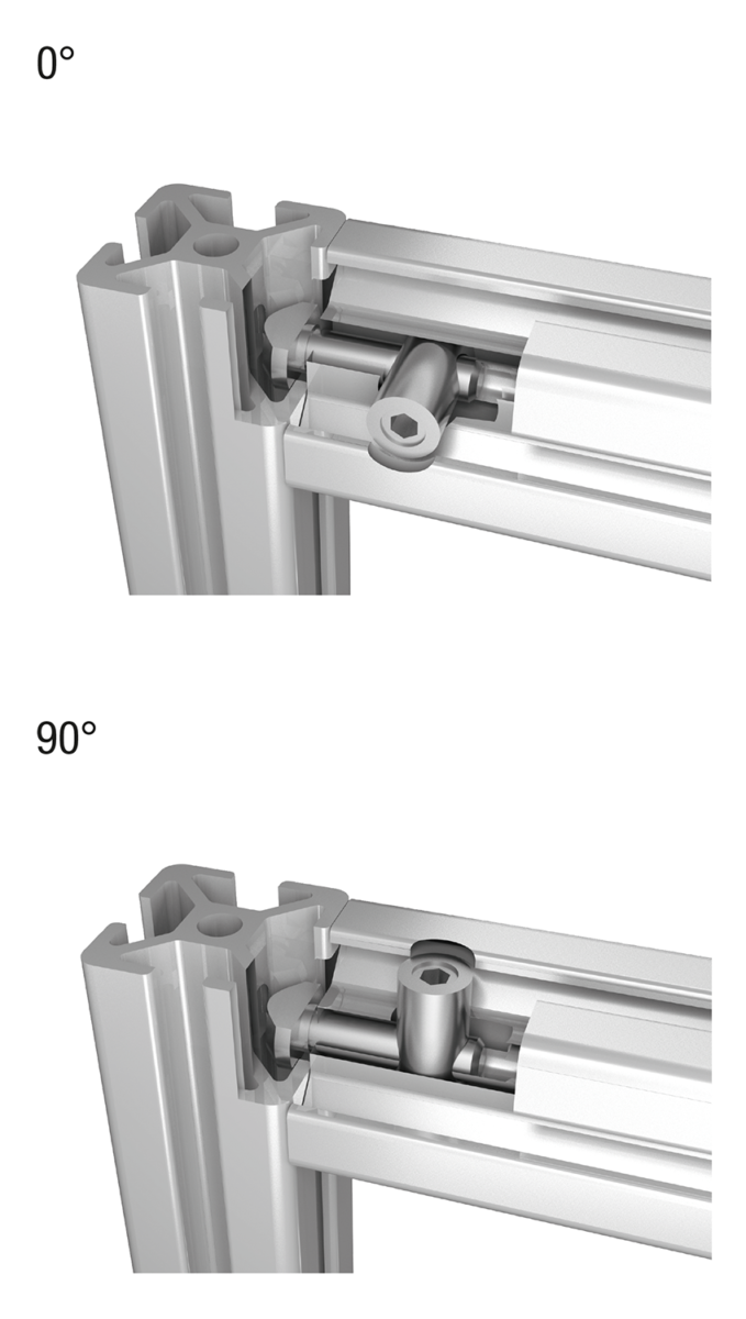 Los juegos de unión resultan adecuados para unir dos perfiles de aluminio en ángulo recto. Los juegos de unión permiten un posicionamiento libre de los perfiles. Las ranuras de perfil posicionadas entre sí en ángulo recto permanecen libres. De esta forma, los elementos superficiales se pueden alojar en las ranuras de perfil sin necesidad de mecanizado adicional.