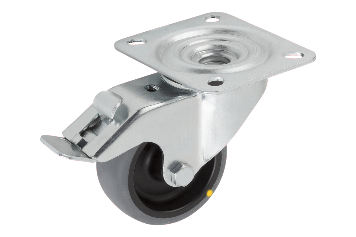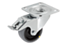 Eje de rueda atornillado. Rodillos guía y ruedas fijas con placa para atornillar. Ruedas conductoras de electricidad lisas de color gris. La resistencia óhmica de la rueda es menor de 10⁴Ω.