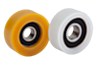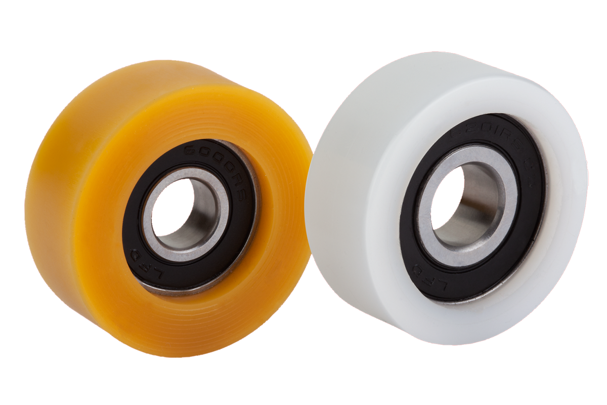 Superficie de rodadura de Extrathane con dureza de 92° Shore A y color marrón claro o de poliamida 6 con dureza de 70° Shore D de color blanco.