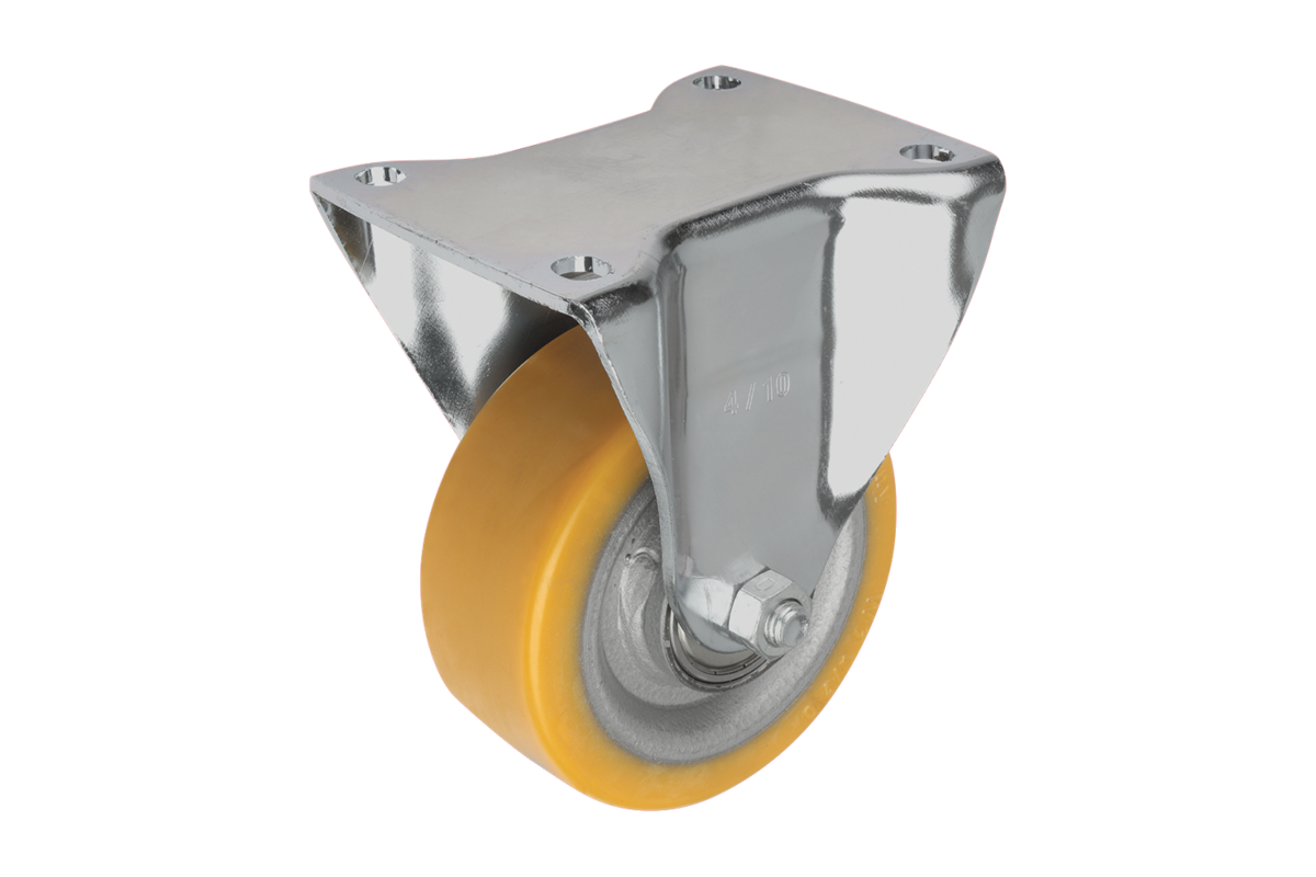 Estos rodillos y ruedas son especialmente resistentes contra golpes e impactos. Las ruedas son resistentes a la abrasión, elásticas y silenciosas. Eje de rueda atornillado.