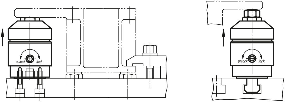 3. Al girar en sentido contrario (”unlock”) se suelta la sujeción. Si se sigue girando hacia atrás, hasta el tope, el perno de apoyo se coloca en posición final.
