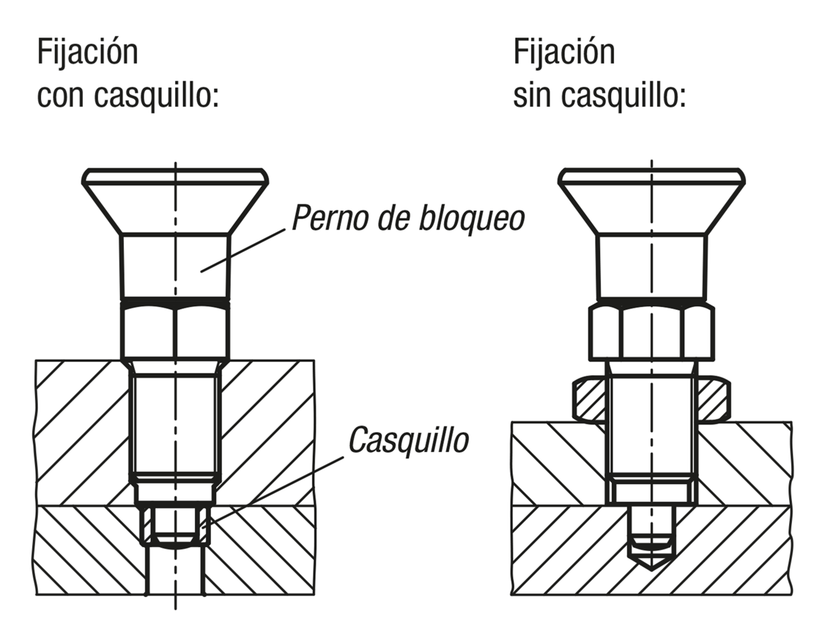 Los pernos de bloqueo se utilizan para impedir que la posición de bloqueo cambie por fuerzas transversales. El perno solo puede colocarse en otra posición de bloqueo una vez que se haya desacoplado manualmente. Si el estado desenclavado va a durar un tiempo prolongado y se quiere evitar que la clavija de bloqueo rebote, se debe utilizar la forma C o la forma D.