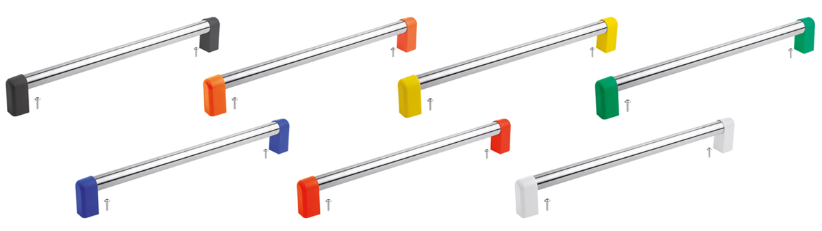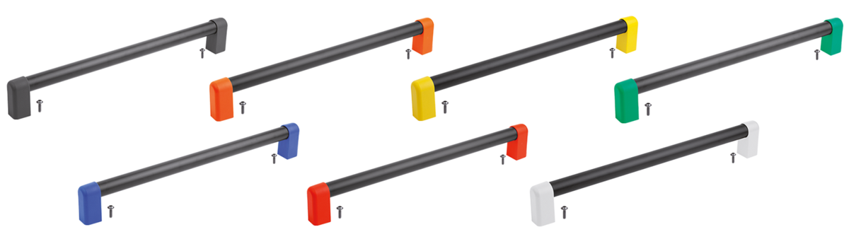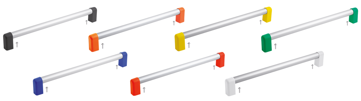 Piezas finales gris antracita RAL 7021, naranja puro RAL 2004, amarillo colza RAL 1021, verde señal RAL 6032, azul tráfico RAL 5017, rojo tráfico RAL 3020 y gris claro RAL 7035.