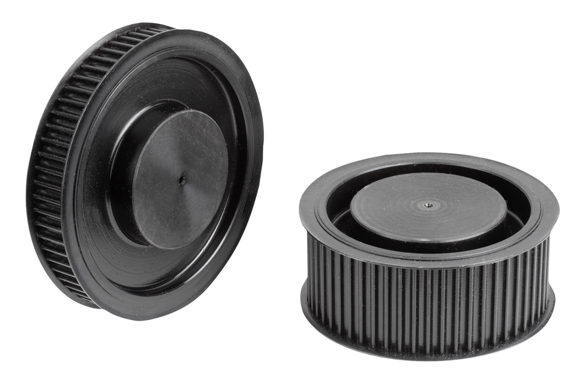 Perfil HTD padrão com divisão métrica (dentes semicirculares). No mínimo, uma polia deve apresentar bordas. As polias possuem um furo de centragem e já são pré-furadas (variável de acordo com a técnica de produção). Por este motivo, a dimensão D2 máx. denominada na tabela é o valor máximo do furo com o qual as polias são fornecidas. Estes furo de centragem/pré-furagem podem ser complementados pelo cliente com um furo de ajuste, um furo de ajuste com rasgo ou um furo roscado. Como alternativa, o cliente pode inserir buchas para reduzir o diâmetro.