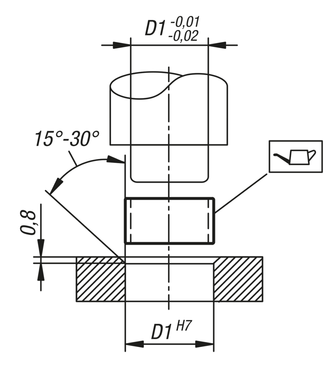 Pressione o mancal deslizante para dentro, não crave. É recomendada a utilização de um mandril de pressão. Sem a utillização de um mandril de pressão, ocorre o risco de que a bucha seja deformada na montagem. Após a compressão em uma carcaça com furo de alojamento H7, a tolerância do furo D será de H7.