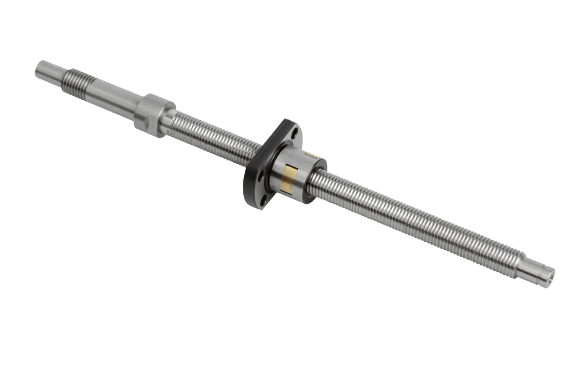Fuso de esferas recirculantes em miniatura com porca flangeada e extremidades de eixos usinadas prontas. Produto já fornecido com lubrificação. É recomendável lubrificar novamente.