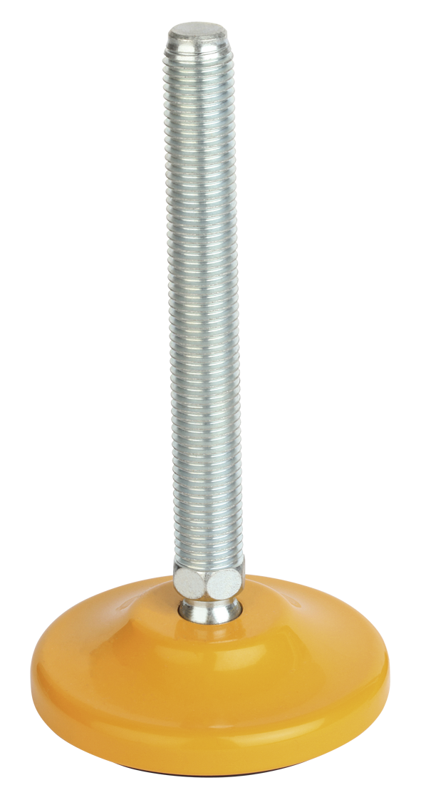 Pé nivelador articulado em aço com pé em amarelo pintado.