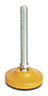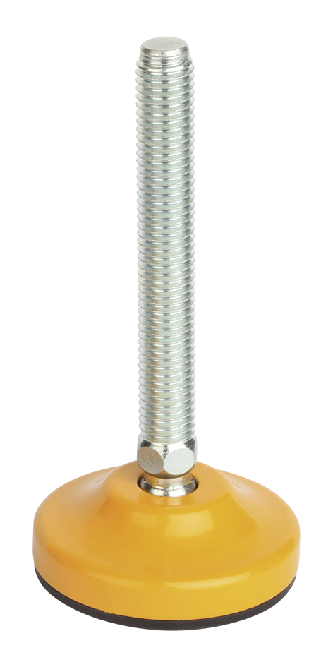 Pé nivelador articulado em aço com pé em amarelo pintado, opcionalmente com disco de apoio anti-vibratório. O disco de apoio anti-vibratório absorve vibrações e evita que o pé nivelador articulado se mova.
