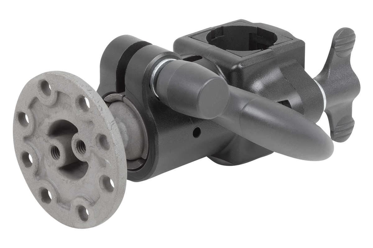 permite um raio de oscilação de 60°. Adequado para cargas até 10 kg (estática). Com placa de aparafusamento universal. O suporte básico é indicado para fixação em tubos redondos de Ø30 mm. Através das buchas redutoras (artigo opcional 29042), é possível conectar ao sistema outros tipos de tubos (redondos Ø20 e 25 mm ou quadrados 20x20 mm).