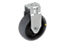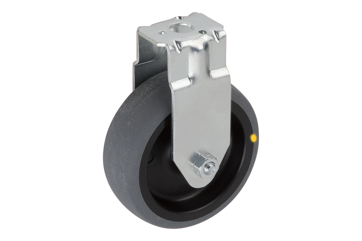 Eixo da roda parafusado. Rodízio industrial fixo com furo traseiro. Roda na versão eletricamente condutiva, sem marcação de rastros, cor cinza. A resistência ômica da roda corresponde a ≤ 10⁴Ω.